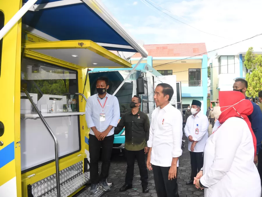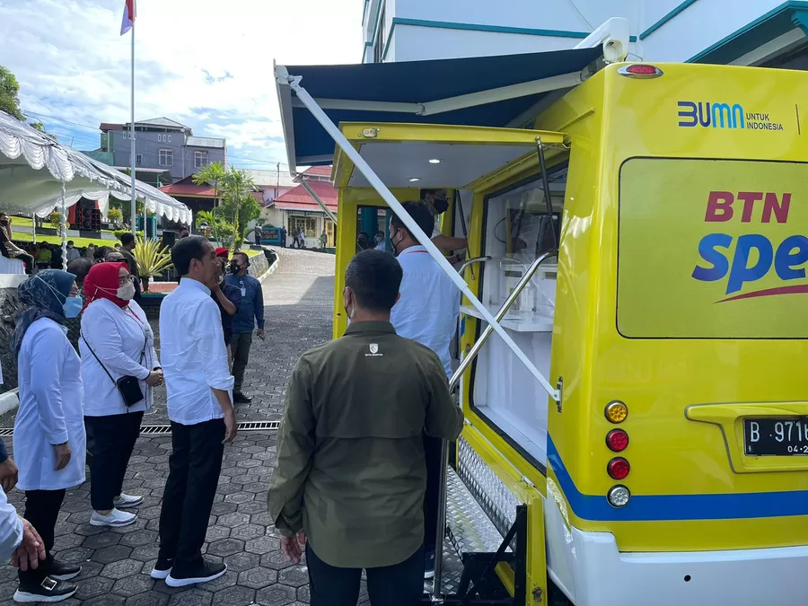 Presiden Jokowi didampingi Menteri Ketenagakerjaan Ida Fauziyah menyaksikan peserta penerima Bantuan Subsidi Upah (BSU) melakukan penarikan dana melalui ATM pada Mobil Kas Keliling (MKK) Bank BTN di Ternate, Maluku Utara, Selasa, 27 September 2022. Presiden Jokowi mengapresiasi pelayanan BTN melalui MKK yang dinilai cepat dan dapat langsung diterima oleh para pekerja sebagai kompensasi kenaikan harga Bahan Bakar Minyak (BBM). Hingga saat ini Bank BTN telah menyalurkan BSU kepada 467.856 pekerja senilai Rp280 miliar.