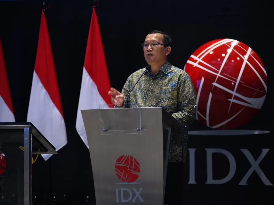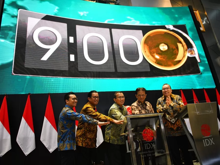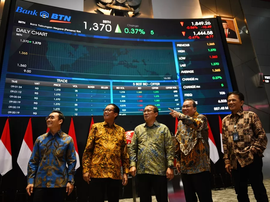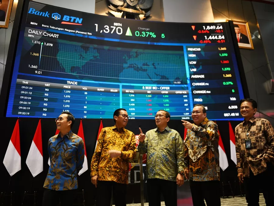 Direktur Utama Bank BTN Haru Koesmahargyo bersama Dirut BEI Iman Rachman didampingi Komisaris Utama Bank BTN Chandra Hamzah, Komisaris Bank BTN Himawan Arief dan Direktur Risk Management Bank BTN Setiyo Wibowo saat melakukan opening bell pembukaan perdagangan saham di Bursa Efek Indonesia (BEI) di Jakarta, Senin, 19 Desember 2022.