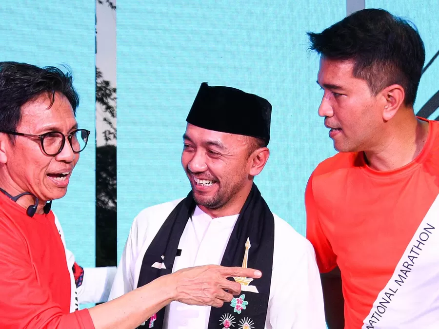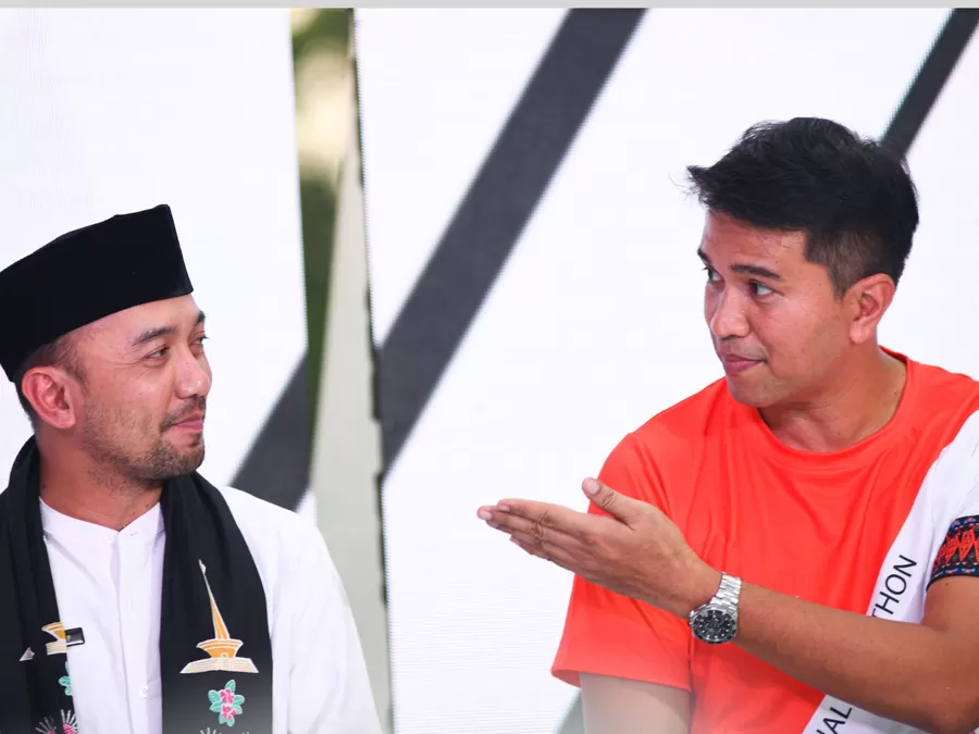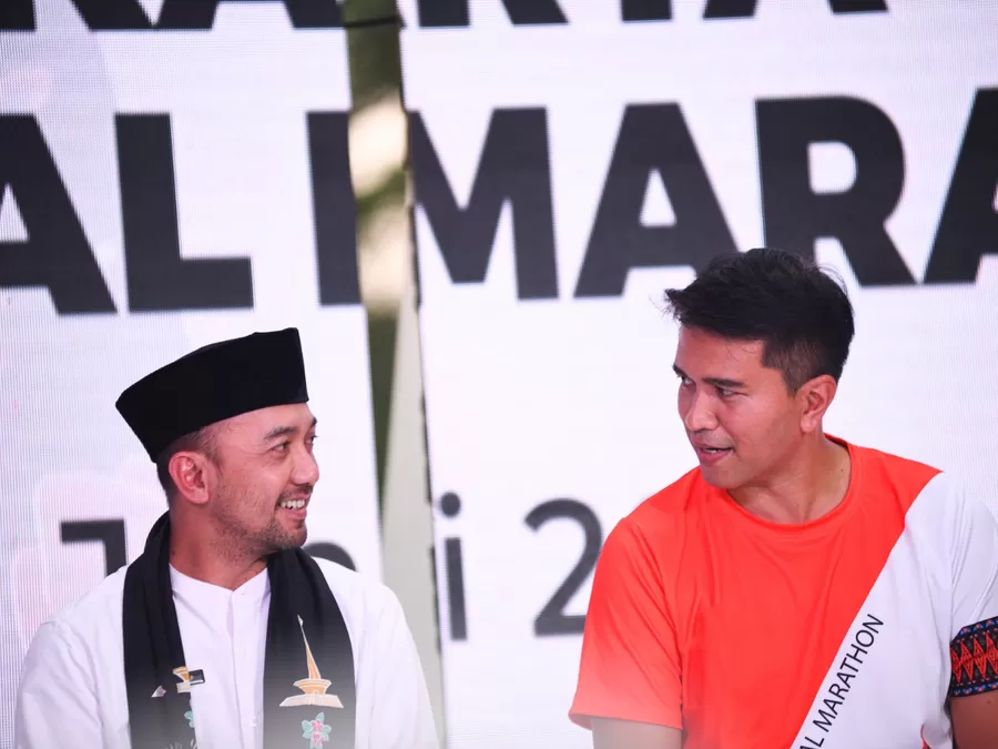 Corporate Secretary Bank BTN Ramon Armando berbincang dengan Plh Kepala Dinas Pemuda dan Olahraga Provinsi DKI Jakarta Hendra Eka Permana saat konferensi pers BTN Jakarta Run 2023 di Jakarta, Jumat 23 Juni 2023.