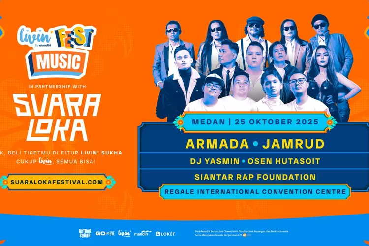 AYOMEDAN.ID - Antara Suara dan Gold Live Indonesia meluncurkan Suara Loka, festival musik multi-kota yang menghadirkan nuansa hangat penuh warna khas Indonesia. Digelar sebagai bagian dari perayaan 27 tahun Bank Mandiri melalui rangkaian LIVIN’ MUSIC FEST, Suara Loka mengusung semangat “Harmoni Indonesia” memadukan musik lintas genre, budaya lokal, kuliner khas, serta nuansa tropis yang ramah dan inklusif.